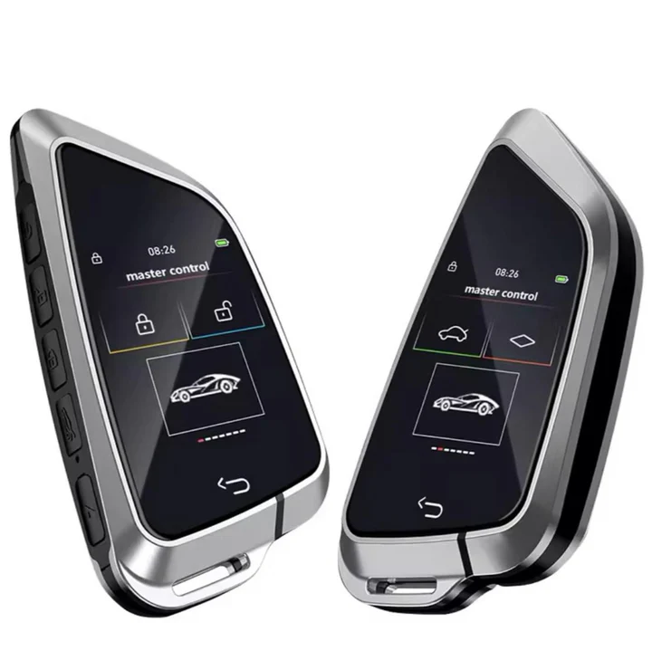 Zwei moderne Fahrzeugschlüssel mit Full-Touchscreen und mehrseitiger Steuerung. Entsperren, verriegeln oder Fahrzeugstatus prüfen – alles direkt über das Display. Perfekt für Premiumfahrzeuge mit Anspruch an Technik und Design.